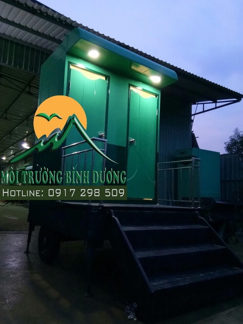 Nhà vệ sinh di động xe kéo. Do Công ty Môi Trường Bình Dương Thiết kế gồm nhà vệ sinh composite 2 buồng đặt trên một xe kéo – Rờ- mooc. 2 buồng vệ sinh dành chon nam hay dành cho nữ riêng biệt. Nhà vệ sinh lưu động kết hợp xem kéo được thiết kế đúng tiêu chuẩn chất lượng để đảm bảo việc kết hợp với phương tiện vận tải để kéo đi trên đường, luân chuyển từ vị trí này đến vị trí khác, từ thành phố này sang thành phố khác vẫn đảm bảo sự chắc chắn, an toàn. Nhà vệ sinh kết hợp xe kéo phục vụ cho nhu cầu phải di chuyển thường xuyên và để nhà vệ sinh cố định xe rờ -mooc khi không cần di chuyển. Thiết kế bậc thang lên xuống tiện lợi.