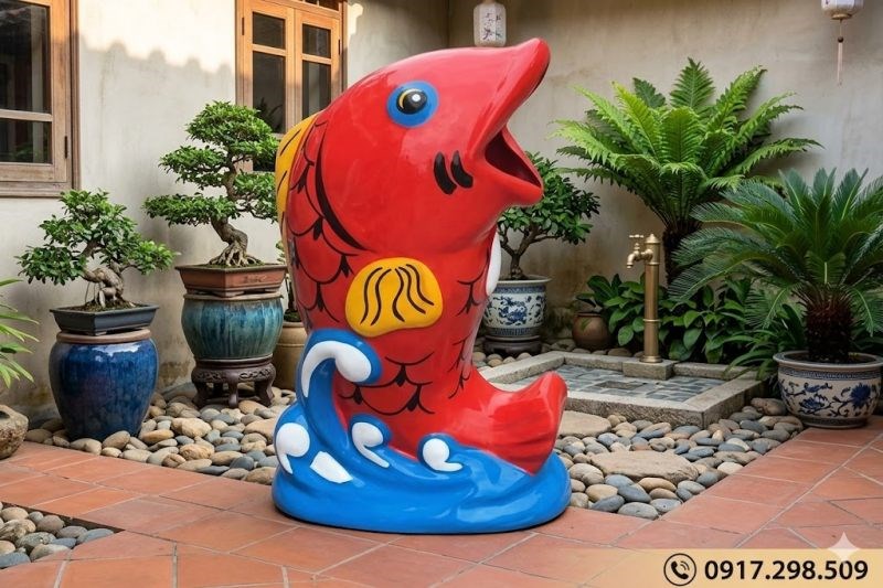 - Màu sắc rực rỡ: Khách hàng có thể tùy chọn màu sắc (đỏ, cam, vàng, xanh...) hoặc phối màu theo nhận diện thương hiệu của dự án. Bề mặt nhẵn bóng giúp chú cá chép luôn nổi bật giữa không gian cảnh quan.